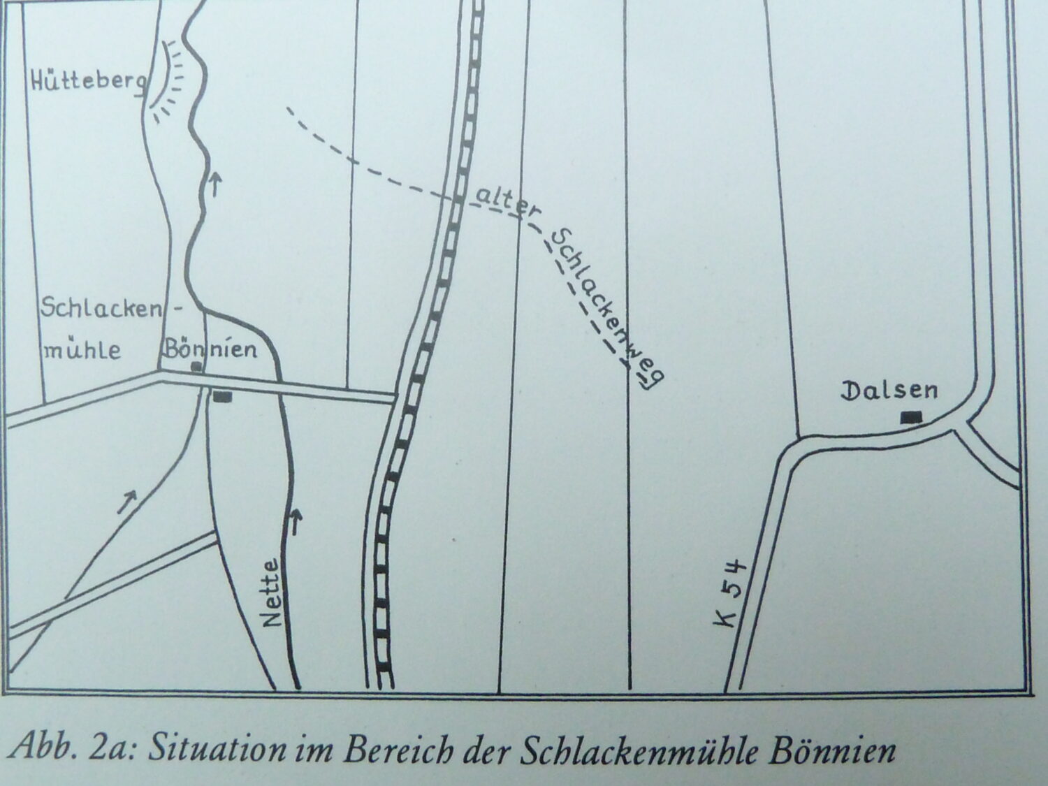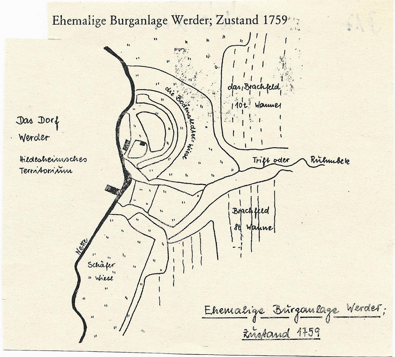 Über die Brücke in Richtung Schlewecke auf der linken Seite war unter der alten Flurbezeichnung „Die Bohsterwiesen“ von 1759 die alte Burganlage verzeichnet, von dem auf dieser Karte des 18.Jh.vorhandenen halbrunden, nach Westen offenen, im Osten dem Ruhmbach von Schlewecke kommend umflossenen Wall mit Gräben auf einer ehem. Insel der Nette (im Westen) ist nichts mehr vorhanden. Rechts oder südlich der jetzigen Ruhmbachstraße K 310 liegt die Schäferwiese. Südwestlich erstreckt sich die Grenze bis an die Gemarkung Bönnien und enthält Bezeichnungen, wie “Am Hütteberg“. Aufgrund von Schlackenfunden, konnte unser Heimatforscher Manfred Klaube in unserem Gebiet Verhüttungsstellen ausmachen, deren Ursprung aus der Erzverhüttung im frühen Mittelalter aus dem Rammelsberg bei Goslar stammen.